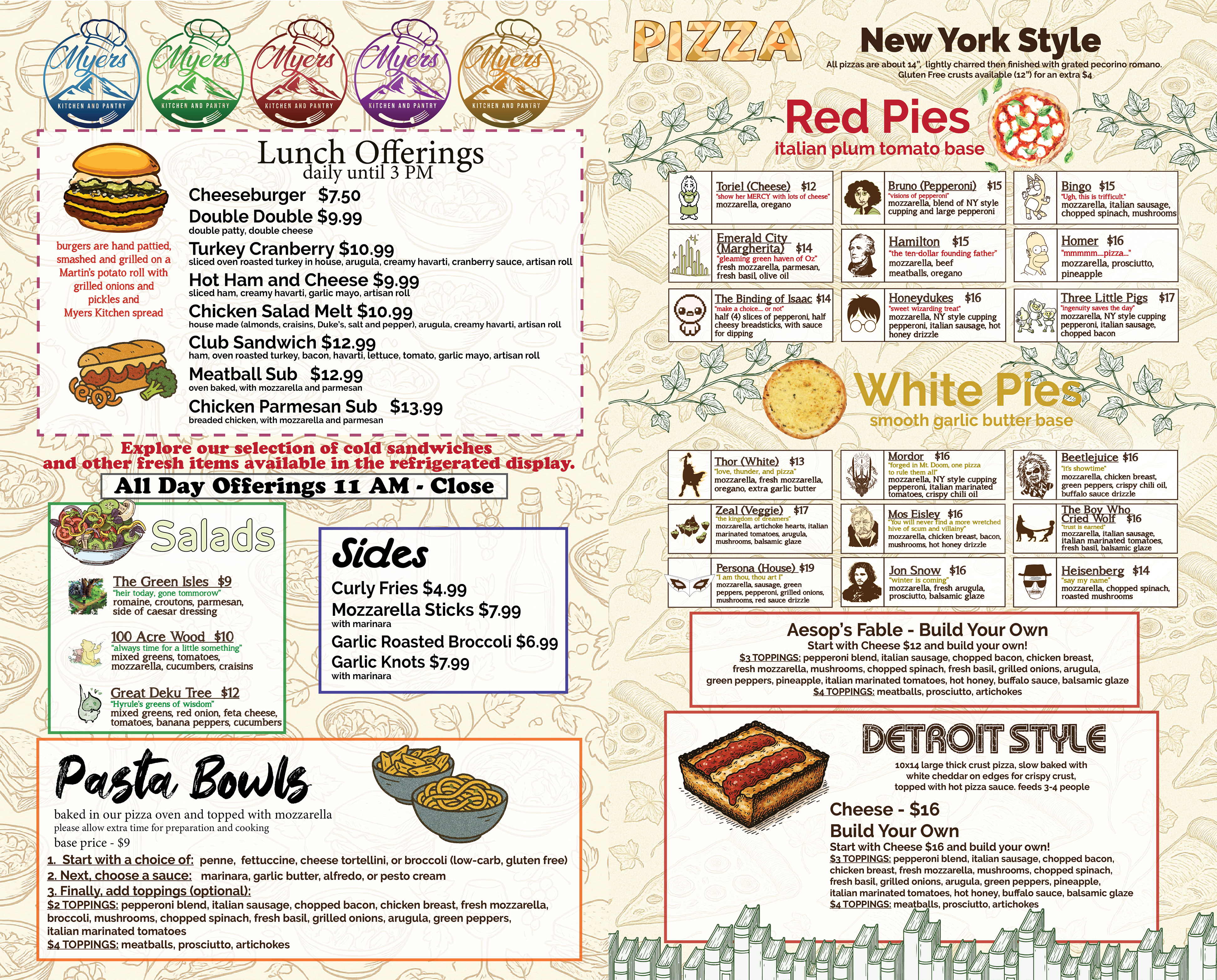 Drawing inspiration from a memorable trip to New York City, we have meticulously crafted our pizzas with utmost attention to flavor, texture, ingredients, and quality of the sauce, cheese, and dough. Our aim is to ensure that your pizza experience leaves you thoroughly satisfied. As ardent enthusiasts of captivating narratives, we have named each pizza, salad, and mac and cheese dish after legendary, heartwarming, and emotionally engaging stories from various mediums. We sincerely hope that you relish your meal, and remember, as the saying goes, 'one bite, and everyone knows the rules.