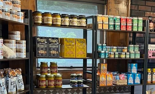 For takeout, we offer fresh and frozen foods prepared in our kitchen, such as vegetables, meats, quiches, homemade pies, daily soups, and homemade bread. We also have fresh seafood and meats, as well as fresh produce from local farms. We also offer pantry items from local vendors, mostly from North Carolina. We are keeping the former "coffee counter" as a community counter for locals to sit, chat, drink coffee, and enjoy fresh soup or pizza. It is all takeout!